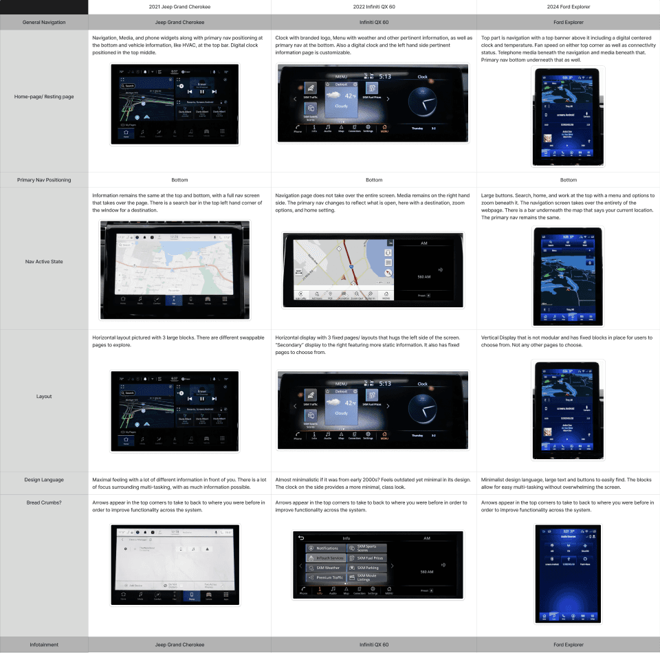 I conducted a competitive analysis of three vehicles comparable to the Grand Cherokee, evaluating 35 features across each system. This included navigation flows, climate interactions, media controls, personalization, safety integrations, and voice systems.