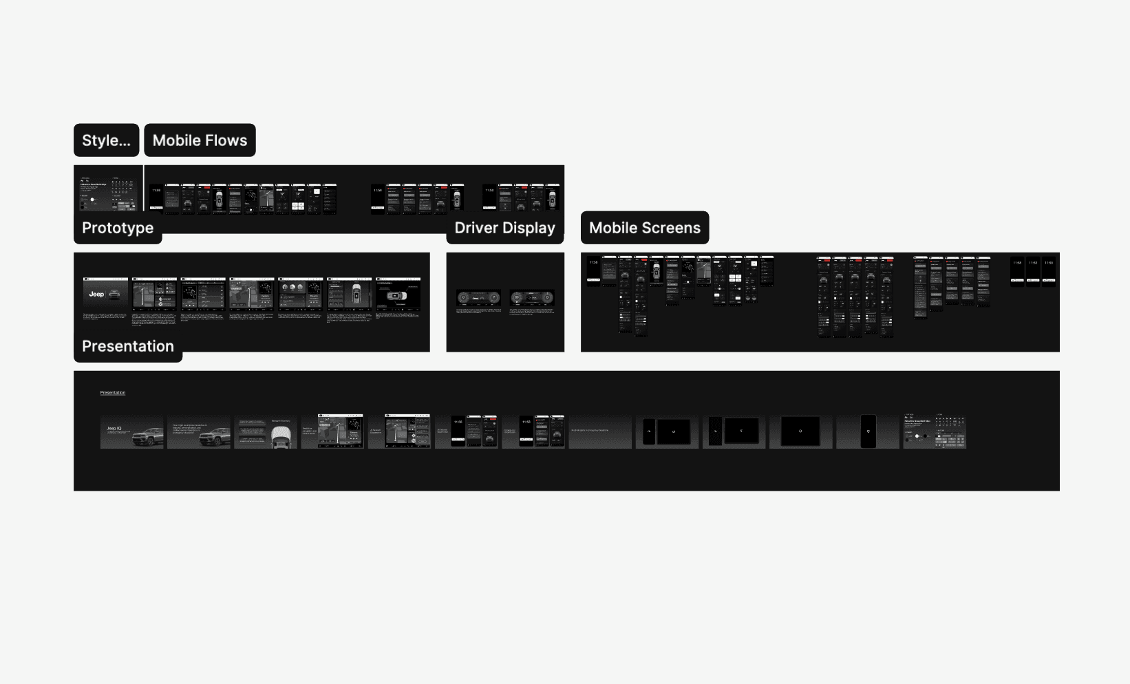 With a validated visual system and interaction framework in place, I transitioned into full-scale implementation, translating the refined concepts into functional, production-ready interface designs. This stage focused on building out complete user flows, ensuring component-level consistency, and stress-testing the system under real driving constraints. Each decision aimed to uphold the design principles defined earlier: clarity, predictability, safety, and Jeep-authentic character.