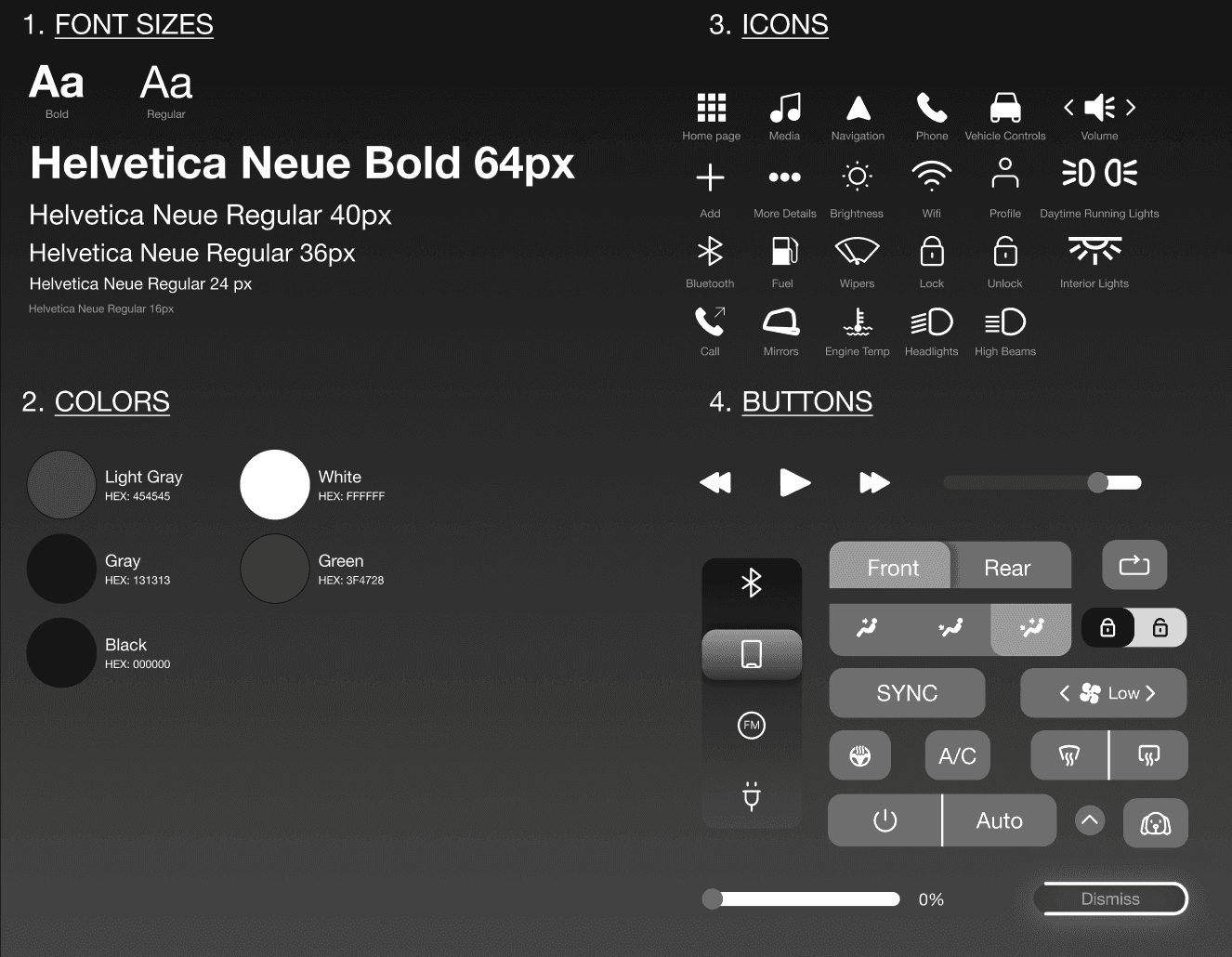 The culmination of this research-driven process was a fully realized set of infotainment concepts that felt cohesive, intuitive, and distinctly aligned with the Grand Cherokee brand. By grounding every design decision in a clearly defined style guide, the final interfaces demonstrated strong visual consistency and a level of clarity that supports safe, at-a-glance interaction, critical for in-vehicle environments. The system’s typography, iconography, and color language worked together to reduce cognitive load, while the modular grid enabled clean, structured layouts that scaled effectively across different screen types and driving contexts.