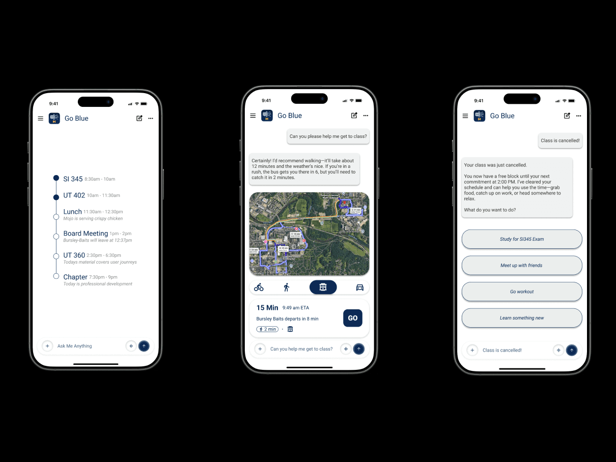 The Go Blue AI prototype delivered a cohesive, high-performance solution that students described as "the app the University should have built years ago." During walkthroughs, users noted that the 'My Day' feature significantly reduced the "app-switching fatigue" they felt every morning.