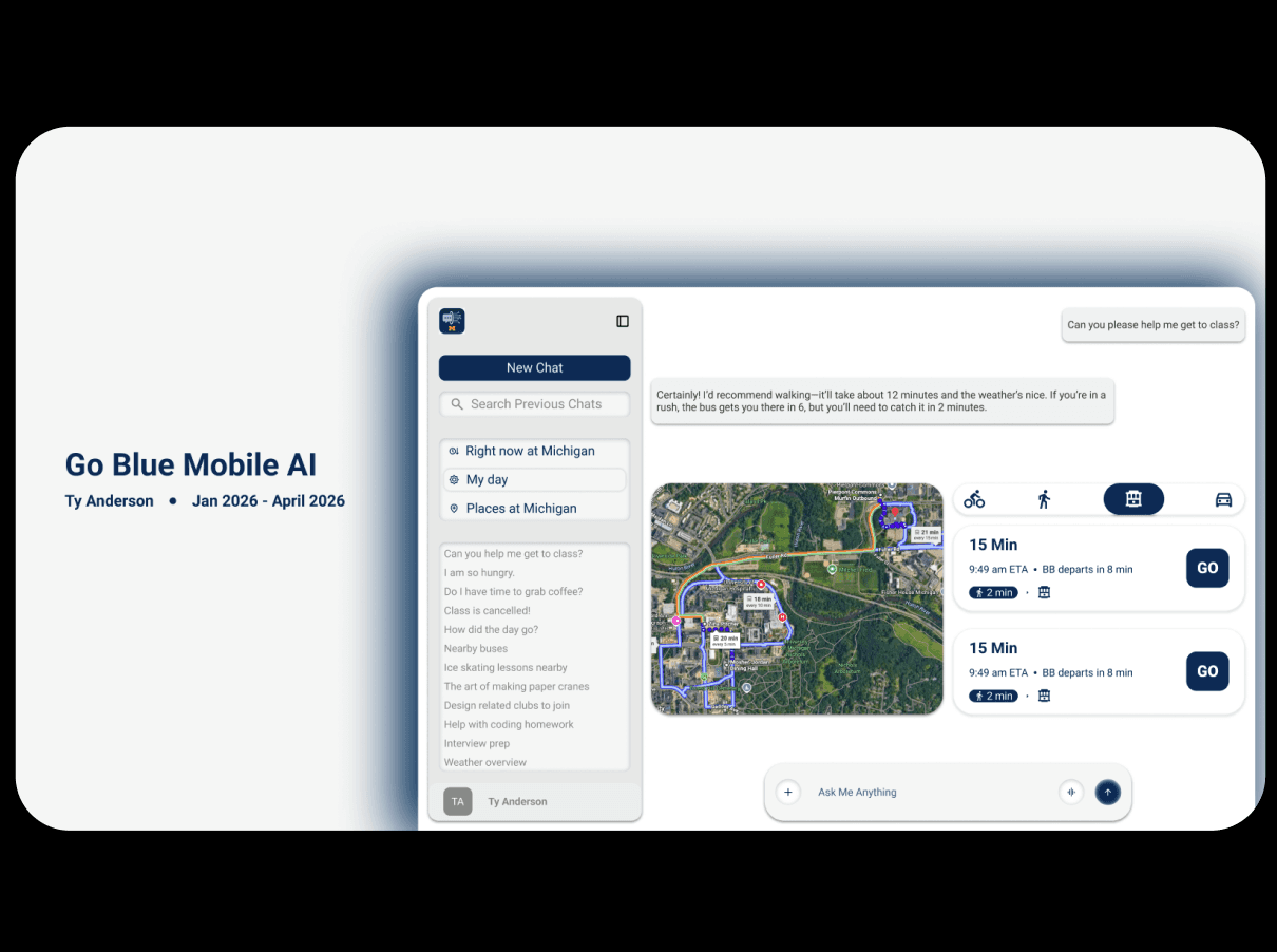 Go Blue AI stands as a testament to my ability to take complex, fragmented data and turn it into a user-centered product. It showcases my skills in product thinking and my commitment to solving the "hyper-local" problems that define the student experience.
