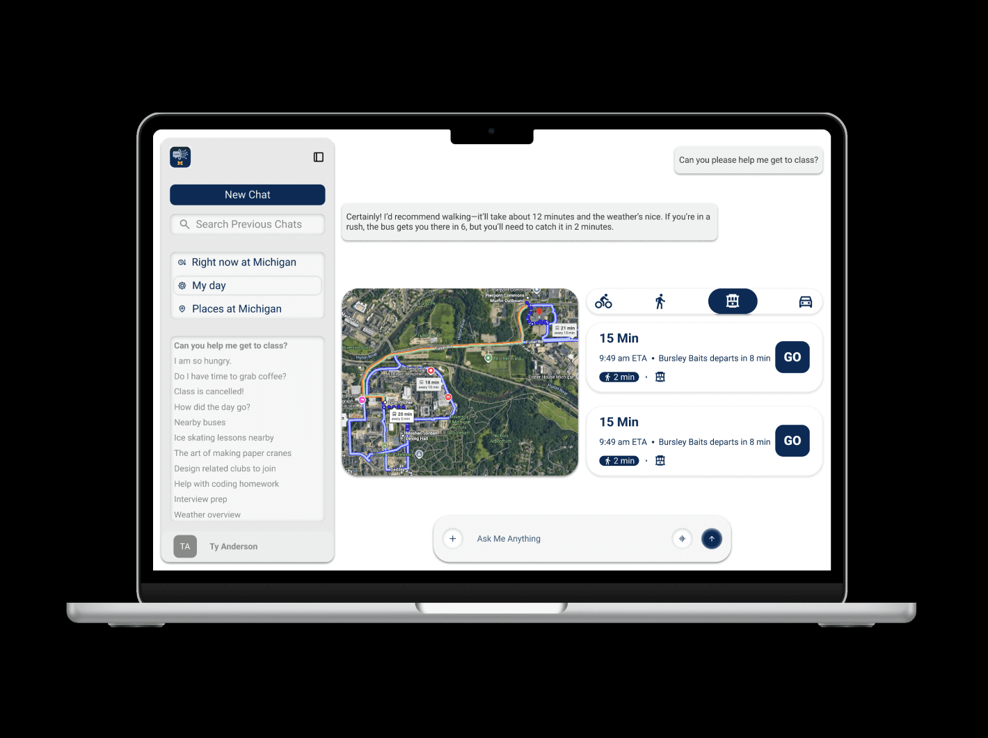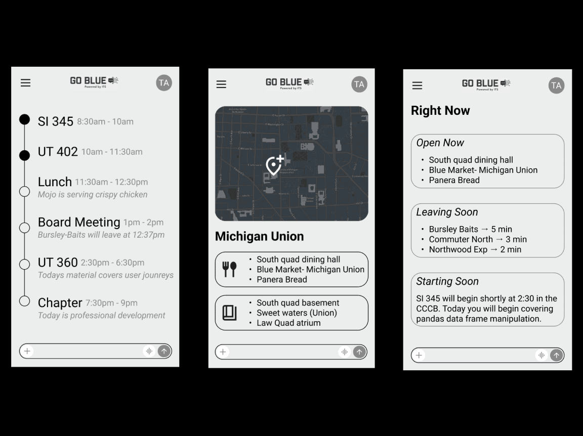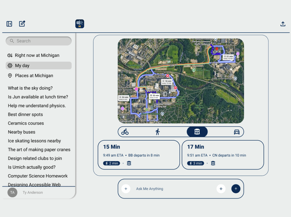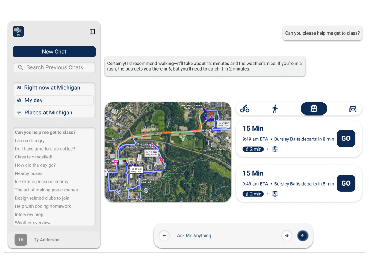 My project began with a shared frustration echoed by students across all campuses: managing student life is a logistical nightmare. Students currently jump between M-Bus for transport, Canvas for schedules, and Michigan Dining for menus. This fragmentation is especially taxing for North Campus residents, where a three-minute delay in catching a bus can result in a missed lecture on Central Campus.