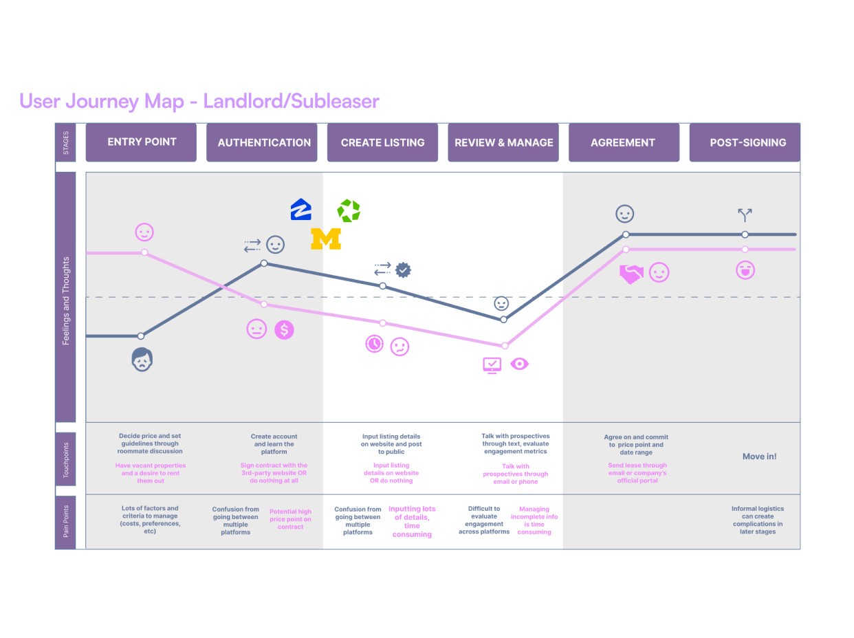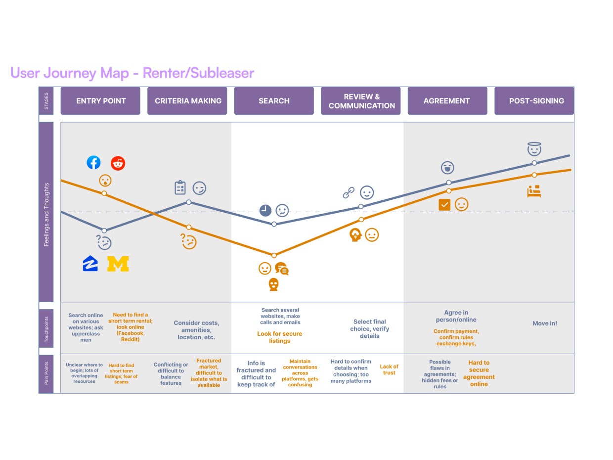 The core challenge was designing a platform that addresses the full ecosystem of student housing—not just the browsing experience. To tackle this, I synthesized research into distinct problem statements that guided the design: