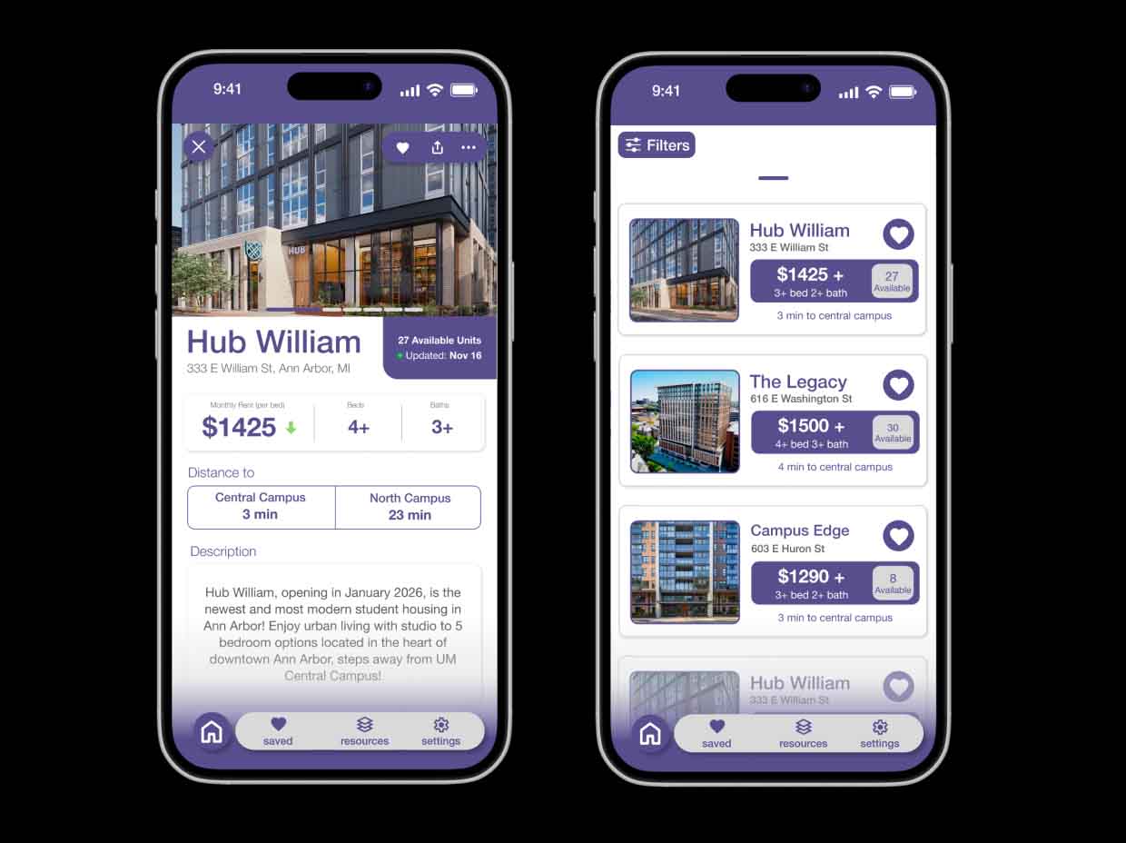 The resulting PurplePad concept delivered a significantly clearer, more intuitive experience than existing tools, validated through informal walk-throughs with students and reviewers. Students reported that the flows felt more predictable, data was easier to find, and subleases were finally treated as a first-class housing option rather than a hidden afterthought.
