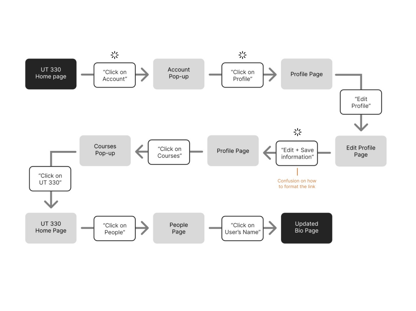 User 1: Confusion formatting links; took indirect paths; difficulty distinguishing profile vs. course page